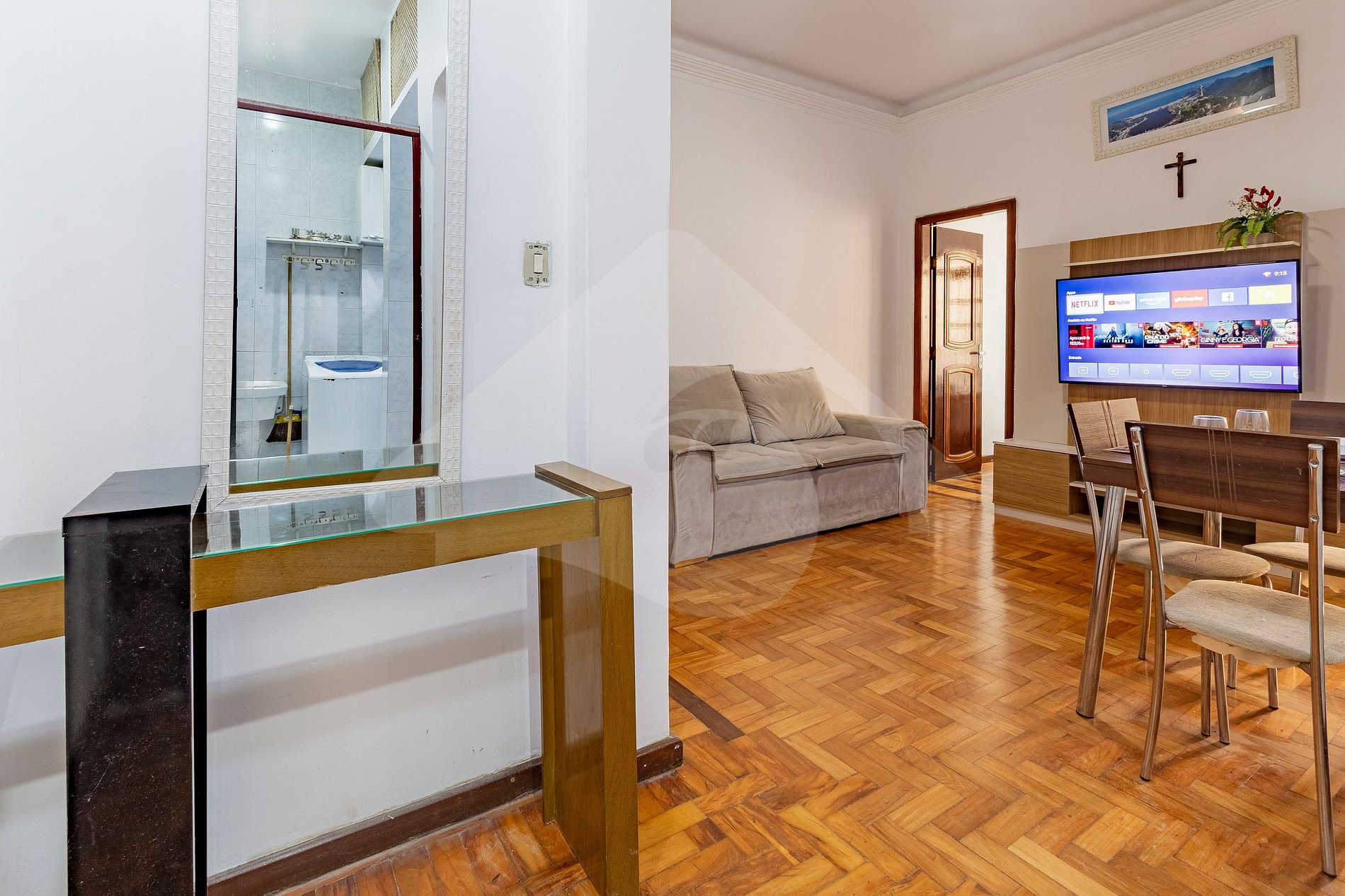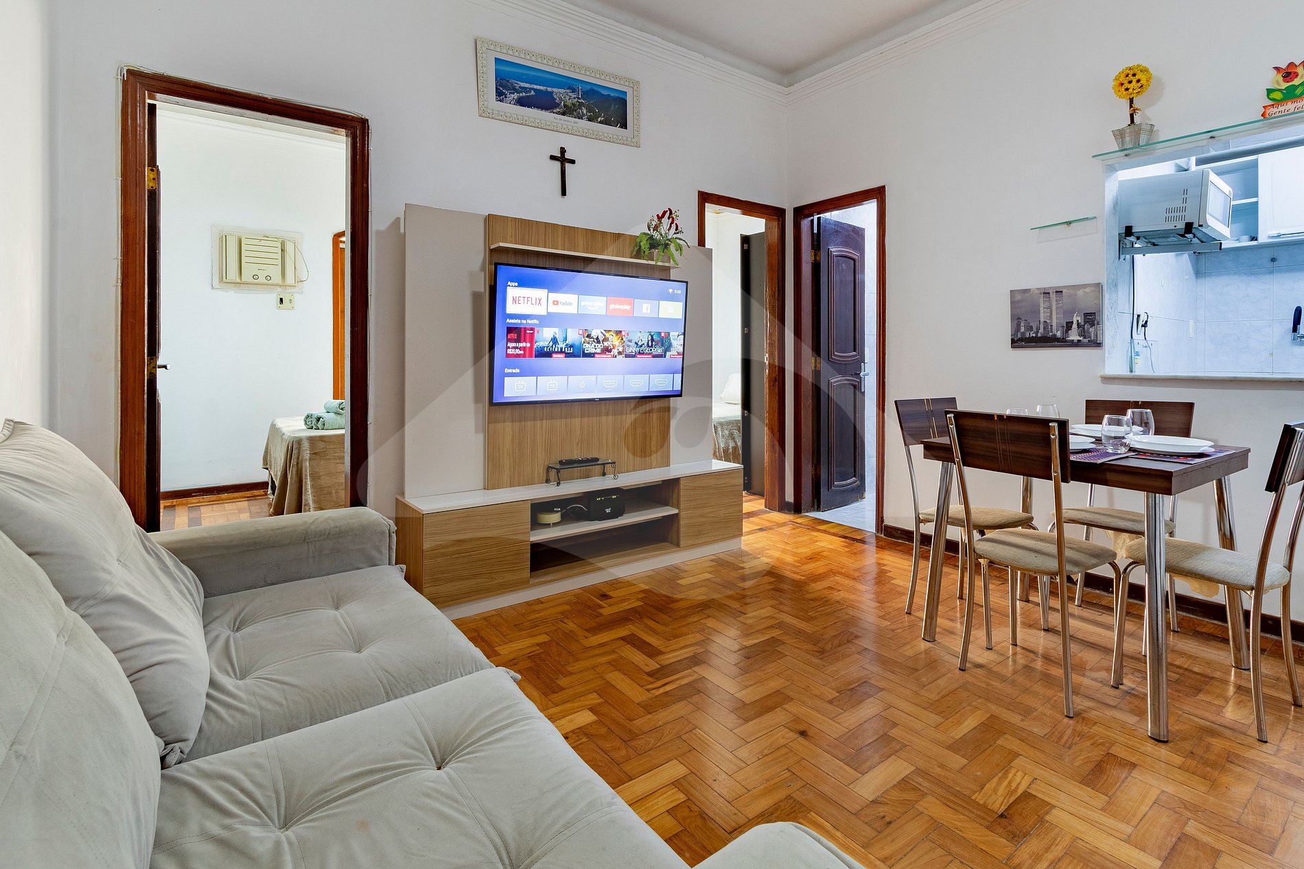 This apartment was designed to be your practical home in Rio. The living room invites you to relax on the sofa after a day at the beach, watching your favorite movies and series on the Smart TV. The kitchen, although compact, is equipped with the basics for preparing breakfast or quick meals.