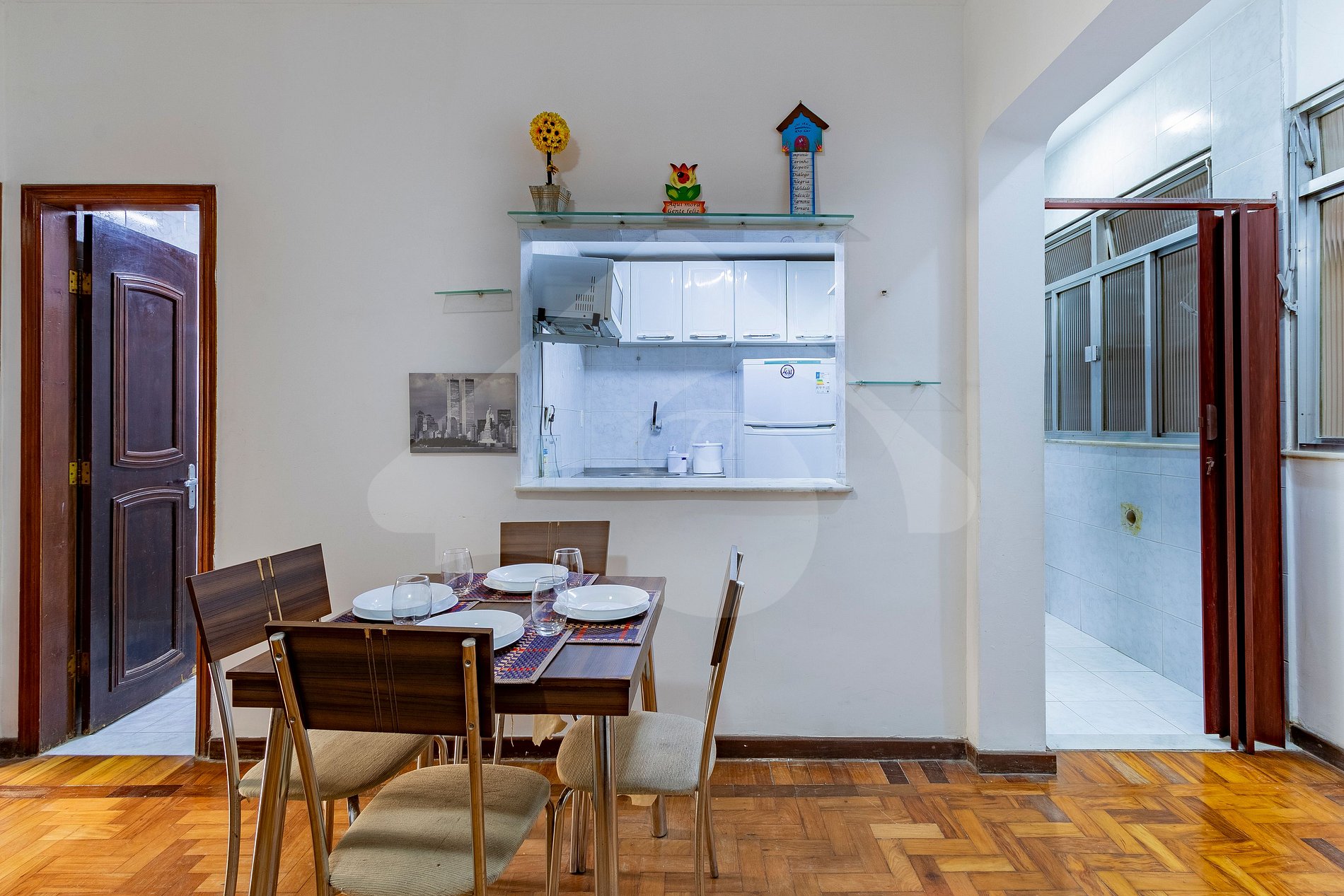 Este apartamento fue pensado para ser tu hogar práctico en Río. La sala de estar es una invitación a relajarse en el sofá después de un día de playa, viendo tus películas y series favoritas en la Smart TV. La cocina, aunque compacta, está equipada con lo básico para preparar un desayuno o comidas rápidas.