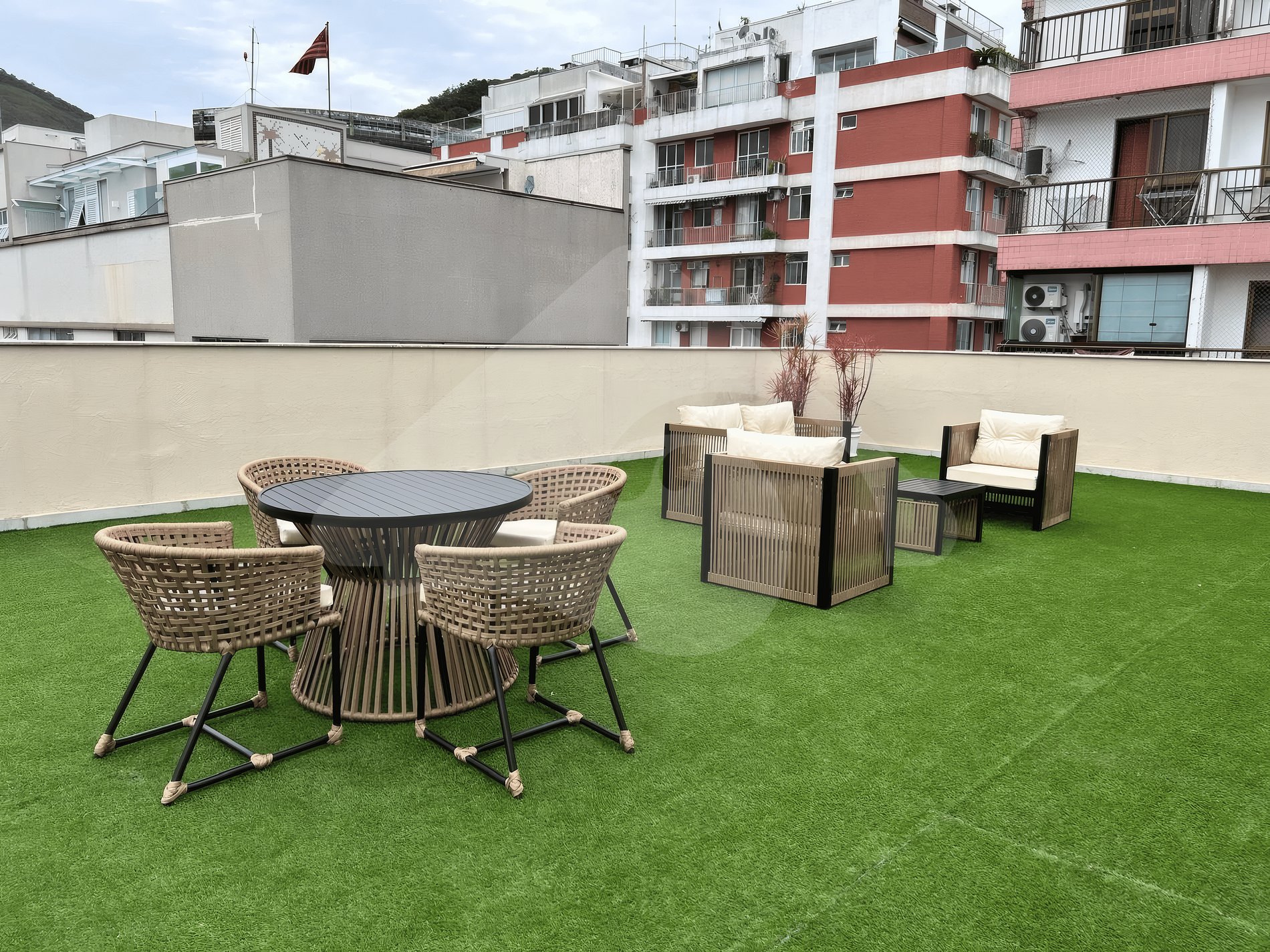 O rooftop é um dos destaques: dividido em dois ambientes, oferece uma piscina ao ar livre cercada por espreguiçadeiras e mesas, além de um espaço lounge com sofás estofados e uma vista panorâmica para as montanhas. Um lugar perfeito para relaxar após a praia ou curtir o fim de tarde.