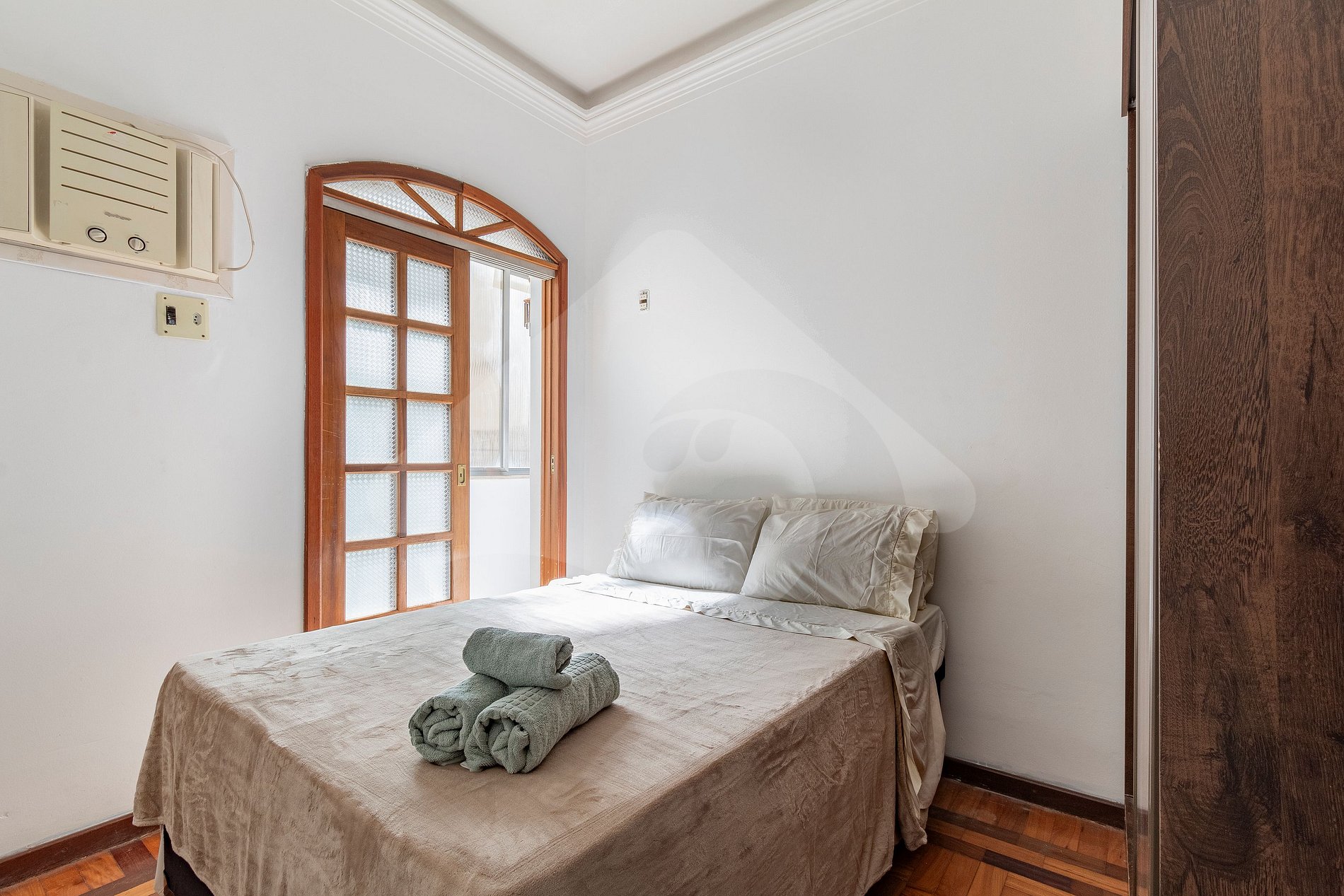 Os dois quartos possuem camas de casal e ar-condicionado para garantir seu conforto térmico. Um diferencial é a varanda interna que conecta os dois quartos, um espaço extra que garante ventilação. A localização é o ponto alto: você estará em um prédio em frente à praia de Copacabana e a 500 metros do metrô.